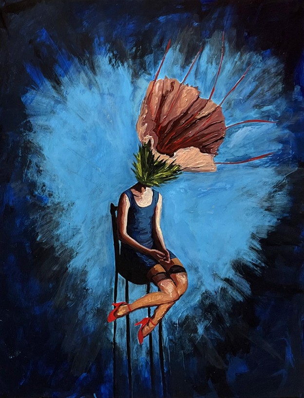 Efflorescence blends the figurative and symbolic in unsettling and deeply personal ways. There are giant mouths, potatoes with echoes of abandonment, plants that twist into memory. The work draws from her own adolescence, her children’s current teenage years, and a past inflected by familial disruption and early emotional solitude. “When I was 12, cancer struck my mom. My dad left for several years. I was very much alone.”