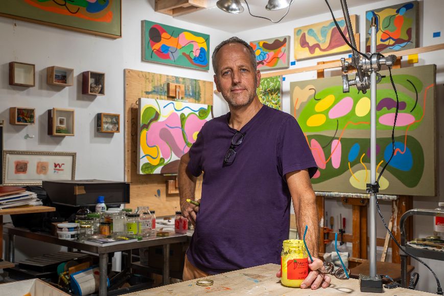 In his Austin home studio, amidst canvases alive with sweeping ovals, kidney shapes, and Rorschach-like kaleidoscopic nature designs, Charles Heppner moves between paintings, photography, and sculptural boxes. The room hums with visual energy: cardinals, branches, butterflies flash across his computer screen, while seas and gardens emerge in photographs and bursts of color appear in framed oil paintings in amorphous organic shapes. Nature, movement, and color are his constants.
