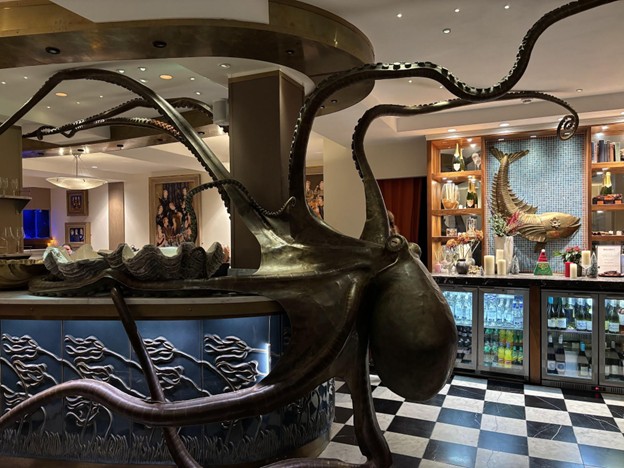 Of course, I acted the tourist upon entering — who wouldn’t, when greeted by a gaudy yet glorious octopus sculpture, all tentacles and shimmer, stretching toward the ceiling like some aquatic deity? A super-friendly chap immediately welcomed us and showed us to our table — unfortunately right next to a table of very loud Americans (and no, I didn’t take it personally). With British tact and a dash of charm, he moved us to a quieter corner without fuss. We got to chatting, and it turned out he was a former actor who’d spent a few misguided years in L.A., only to flee back to London after tiring of Hollywood’s surface-level sparkle. “Too many smiles, not enough soul,” he said.