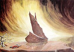 Second image: Set design for Act 1 Scene V of Monteverdi’s Il ritorno d’Ulisse in Patria (the Phaecian ship is turned to stone), prepared by Alfred Siercke for the 1964 production by Hamburg State Opera. Courtesy of Wikimedia Commons.