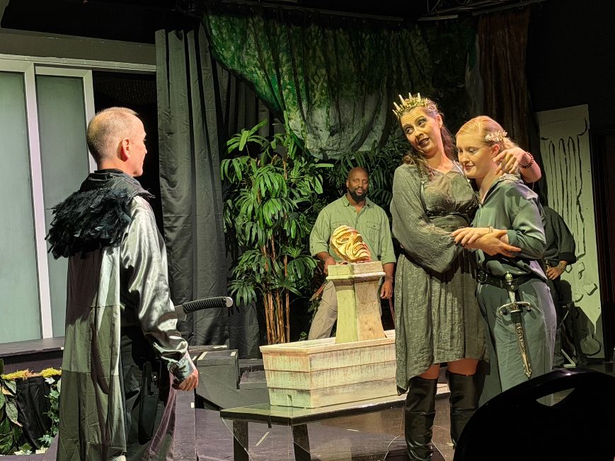 Titus (played by Timothy McKinney) is up against a formidable foe in the person of Allison Paranka, who plays the role of the Queen of the Goths, Tamora. Paranka has previously filled the role of Lady Macbeth, so she knows how to project evil villainy, and it shows. As she leads her husband Saturninus to the dark waters of the river Styx, via a reign of murderous revenge on Titus, we are witness to the most ghastly sights. In 1765, the great Dr. Samuel Johnson questioned the possibility of even staging the play, pointing out that “the barbarity of the spectacles, and the general massacre which are here exhibited, can scarcely be conceived tolerable to any audience.”