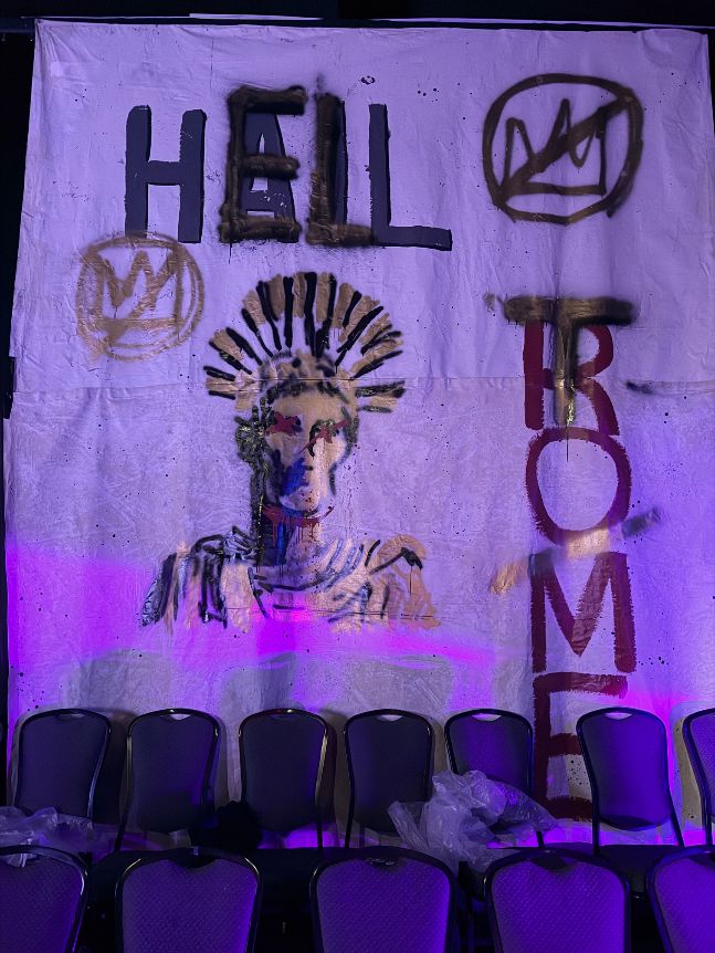 Image of Rome: This large artwork is by director Brian Hensley, who also did set/sound design. Photo by C. Cunningham.