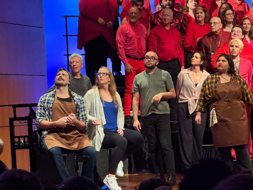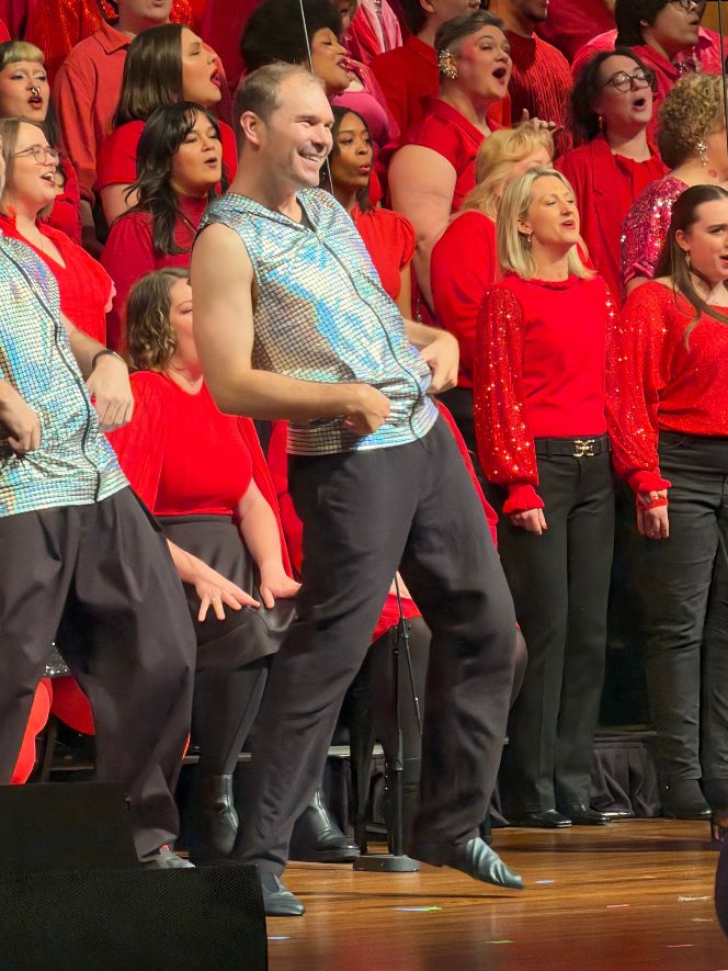 The format of the concert gave the opportunity of the individual members to shine in their own scenarios as opposed to singing in a group. Also, they were able to display their choreography (with some great dance moves) which is typically a secondary part of a pride concert. Here, it achieved equal footing with the singing members of the chorus, all decked out in red, with Valentine’s Day a recent memory from just a week prior.