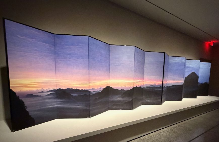 And he created this panoramic photograph of Mount Fuji and down, warm reds and purples behind the mountain’s silhouette: 25 feet wide, printed on paper, mounted on traditional Japanese folding screens.