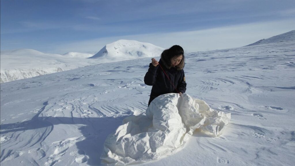 Austin-based artist, Beili Liu, traveled to the Arctic Circle in Norway to five different locations from snowy valleys to semi tundras to the rocky shores and sat in the landscape and sewed. The video showed her a solitary figure in a dark parka.